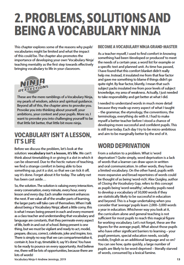 You know sometimes you wish that someone had written a book about something you have to implement? Well if addressing the vocabulary gap in your school/class is that something then Vocabulary Ninja is your saviour. It’s clear, concise and literally your starting point to implement fundamental change yourself. No need to buy in expensive schemes, it just sets out clear guidance and the tools you need to make the change. Oh and who wouldn’t want to be a Ninja! – Amazon Review