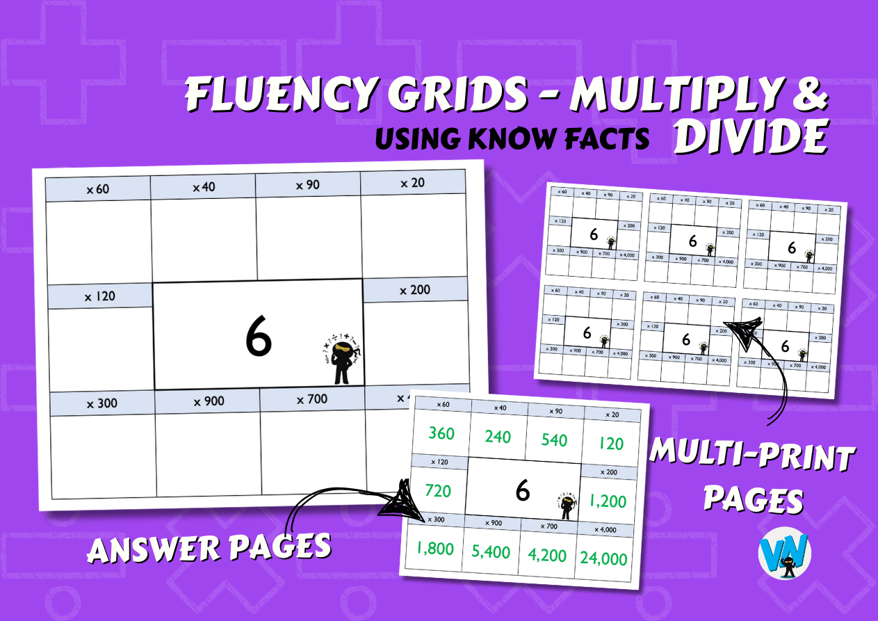 This bundle includes fluency grids focused on multiplying and dividing using known facts. They are epic! Each time table requires pupils use their known times table facts to solve multiplication and division problems! Wonderful. This bundle has 63 slides and contains PDF and PPT versions. Complete with answer slides and multi-print slides for easy printing, trimming, and sticking.