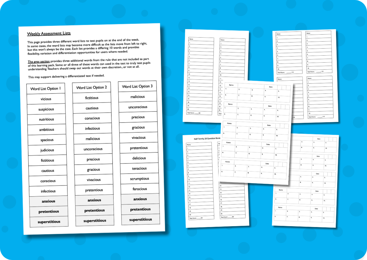 Each weekly pack has all of the resources you need to deliver the test at the end of the week including a variety of answer sheets and even differentiated lists of words to test pupils on which increase in difficulty. This section can be used to extend pupils using the 3 additional words included that are in addition to the work bank.